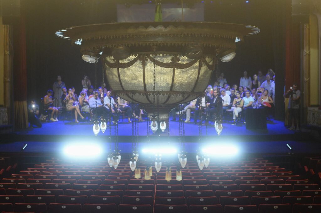 Luego, se dio paso al descenso de la maravillosa araña que ilumina la sala principal, una estructura lumínica de origen francés que fue traída desde el país europeo en 1886 y pesa 500 kilos. Por primera vez en la historia, la bajada se realiza con un motor que adquirió el Teatro y reemplaza el trabajo manual que llevaban adelante el personal.